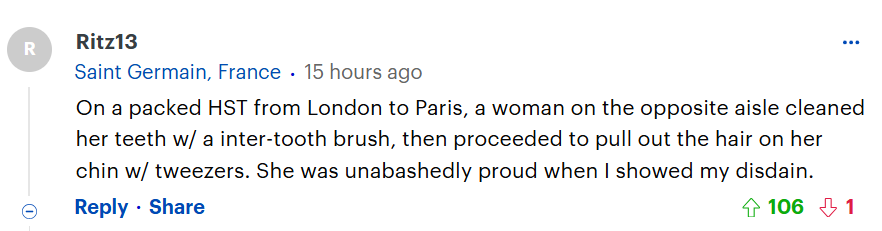 在从伦敦到巴黎的拥挤的 HST 列车上,对面过道上的一位女士用牙缝刷刷清洁牙齿,然后用镊子拔下巴上的毛。当我对她表示鄙视时,她毫不掩饰自己的得意。