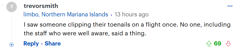我曾经在飞机上看到有人剪脚趾甲。包括那些知道这一点的工作人员在内,没有人对此发表任何言论。