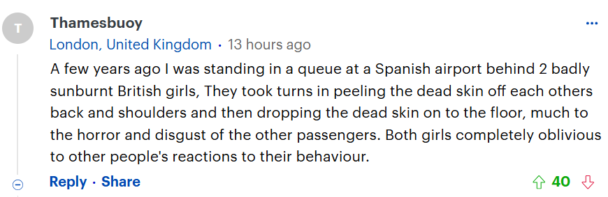 几年前,我在西班牙机场排队时,身后跟着两个严重晒伤的英国女孩,她们轮流从对方的后背和肩膀上剥下死皮,然后把死皮扔到地上,其他乘客对此感到非常惊恐和厌恶。两个女孩完全不顾别人对她们行为的反应。