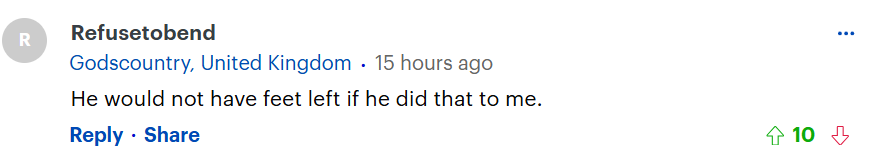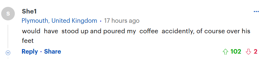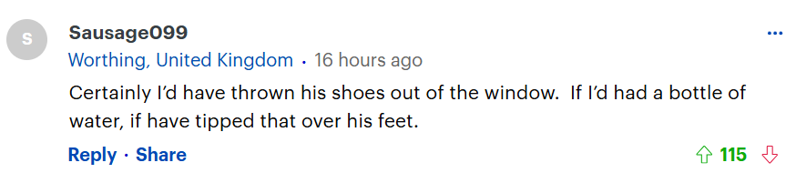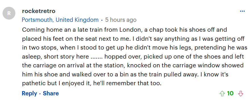 从伦敦坐晚班火车回家时,一个小伙子把鞋脱了,把脚放在我旁边的座位上。我没说什么,因为还有两站就要下车了,当我站起来的时候,他没有动他的脚,假装睡着了,简而言之 .......到达车站后,我跳了过去,捡起其中一只鞋,离开了车厢,敲了敲车厢的窗户,给他看他的鞋,然后走到一个垃圾桶旁,火车开走了。我知道这很可悲,但我很享受,他也会记住的。