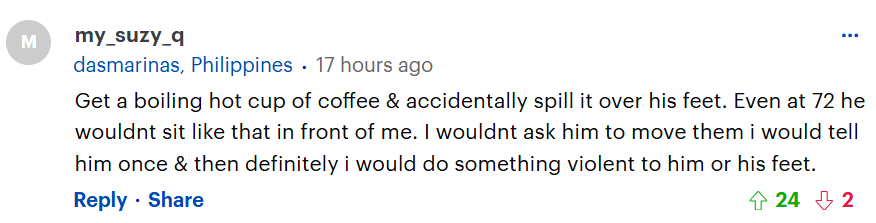 端起一杯滚烫的咖啡,不小心泼到他的脚上。即使他已经 72 岁了,他也不能在我面前这样坐。我不会让他挪开,我会告诉他一次,然后肯定会对他或他的脚施暴。