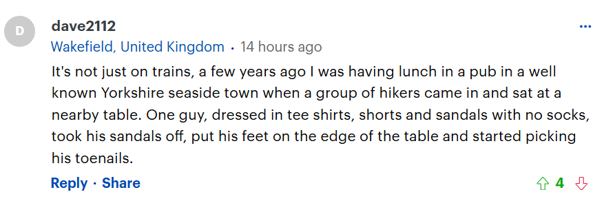 这种事不仅仅发生在火车上,几年前,我在约克郡一个著名的海滨小镇的一家酒吧里吃午饭时,一群徒步旅行者走进来,坐在附近的一张桌子旁。一个人穿着t恤、短裤和凉鞋,没有穿袜子的家伙脱下凉鞋,把脚放在桌子边上,开始抠脚趾甲。