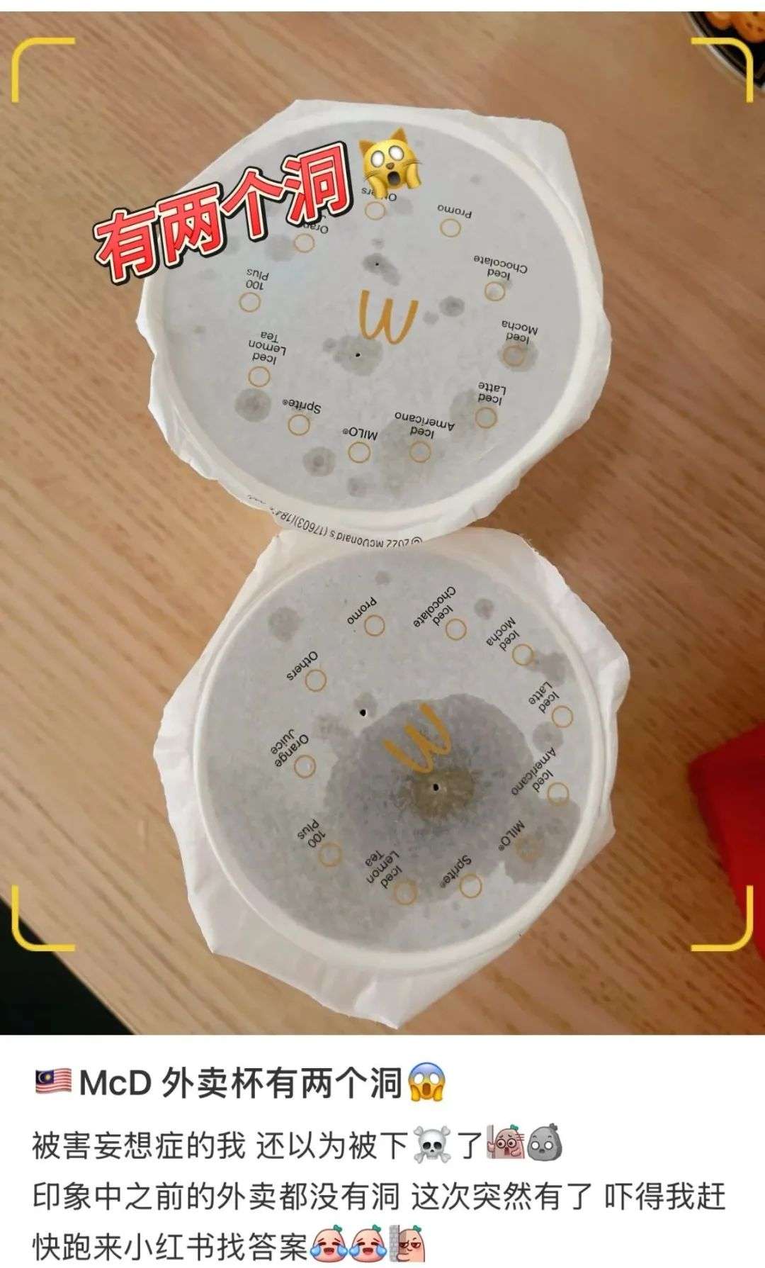 网友晒出一张奶茶杯照片,杯盖上有个诡异的针眼小孔,都不敢喝了,怀疑是给人下毒用的?!