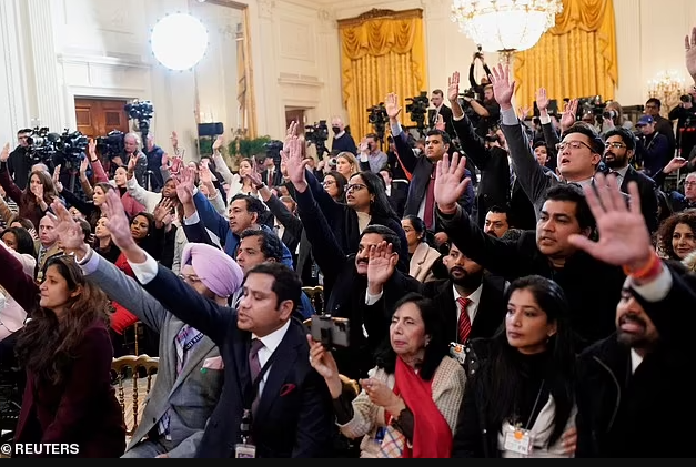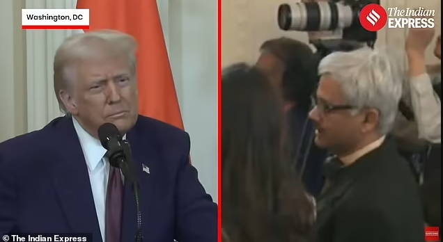 川普最初表示:“我们可以回答几个问题。” 随后,他指向那名未透露姓名的印度记者,说道:“请讲,请讲。对,就是你,蓝色衬衫的。”