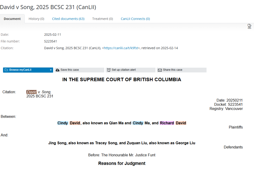 判决书对刘在网上发表的言论一一澄清,Cindy在2006年就获得了加拿大永居,并于2023年入籍,持房产经纪人牌照,兼职房产销售。她的先生则在2018年至2022年间持合法工签,并于2023年拿到枫叶卡,现从事房产开发工作,而惠斯勒的那套房产,是David与前妻购置的。至于退货事件,法官也判定,Cindy的做法是符合商家要求的。