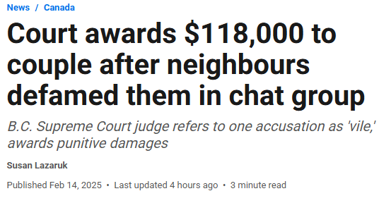 大温滨海豪宅社区Lions Bay的一起邻里间因共享车道引发的纠纷,升级为公开的网络诽谤活动,甚至包括“恶毒”的指控。最终,一对华人夫妇因诽谤邻居被判赔超过10万加元,付出了惨痛的代价。