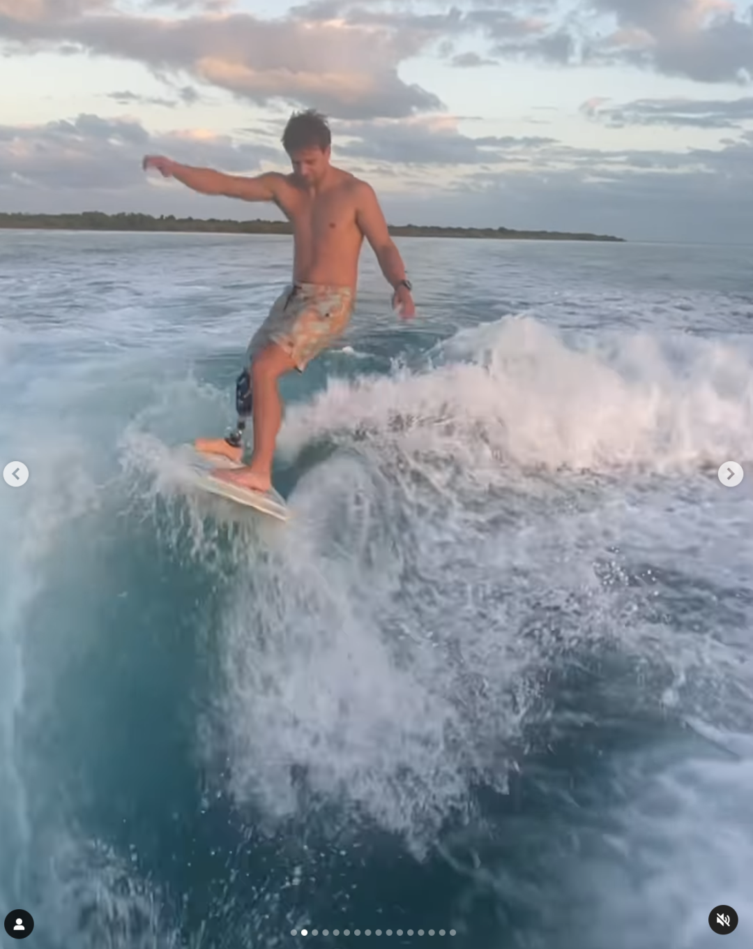 在截肢6个月之后Arsenault再次在Instagram上更新动态,他已经佩戴义肢,再次站在了冲浪板上,在大海中驰骋!