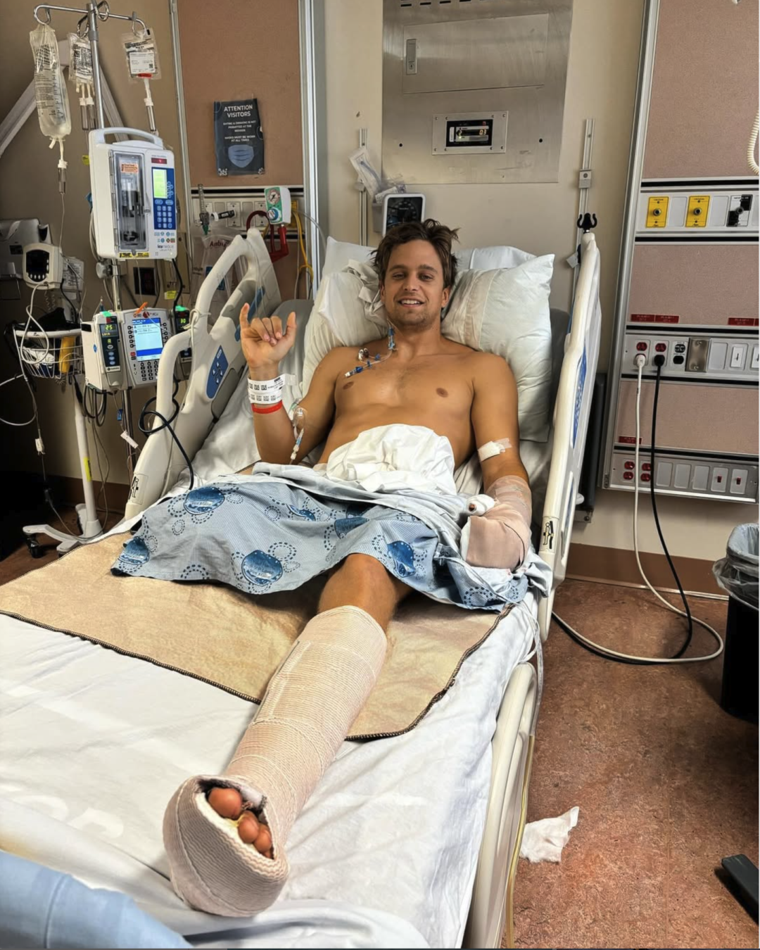 幸存的Arsenault在病床上拍下照片,并用冲浪文化中常见的shaka手势向大家致意。照片中,他的左臂和左腿缠着绷带,而右腿已经不见了。