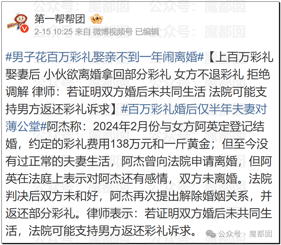 这个事情还有后续,据说法院可能会支持退还彩礼。