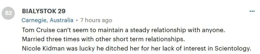 “汤姆·克鲁斯似乎无法和任何人保持稳定关系。他结过三次婚,还有过几段短暂的恋情。妮可·基德曼很幸运,因为她对科学教不感兴趣,他和她分手了。”