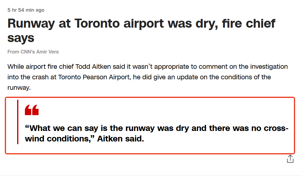 不过,这个说法却遭到了多伦多机场消防局局长的反驳,局长托德·艾特肯敦促公众在调查期间不要猜测坠机原因。
