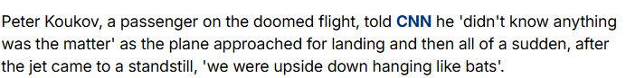 据乘客皮特·库科夫 (Pete Koukov)透露,飞机着落非常的硬,而且他和其他乘客都“像蝙蝠一样悬空”。