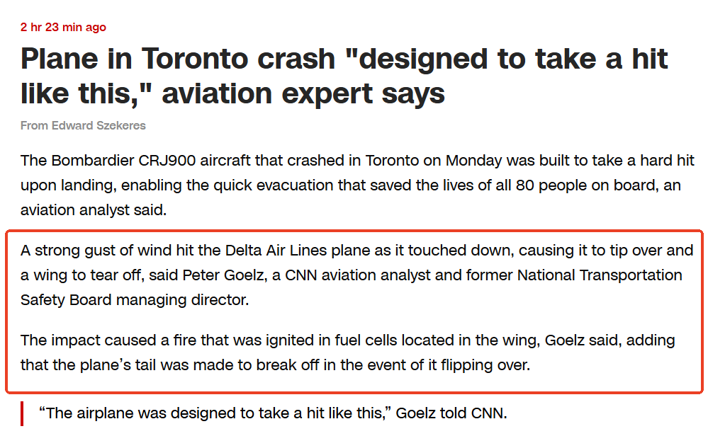 但据CNN 航空分析师、前国家运输安全委员会董事总经理彼得·戈尔茨 (Peter Goelz) 分析,达美航空的飞机着陆时似乎遭遇了一阵强风,导致飞机翻滚,机翼脱落。