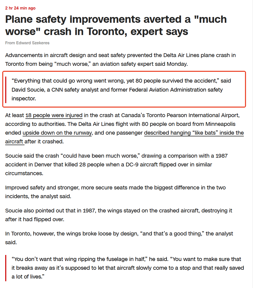 当然,除了安全带,CNN安全分析师、前联邦航空管理局安全检查员戴维·苏西 (David Soucie) 还表示,这次事故能所有人幸免于难,还在于飞机设计和座椅安全的进步。