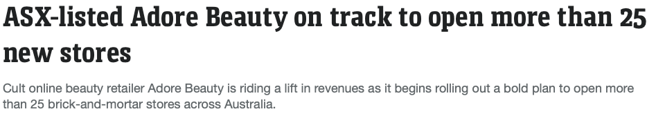 到明年,Adore Beauty的线下版图将扩展至维州、新州、昆州和西澳,与Mecca、Sephora等传统美妆零售商正面交锋。