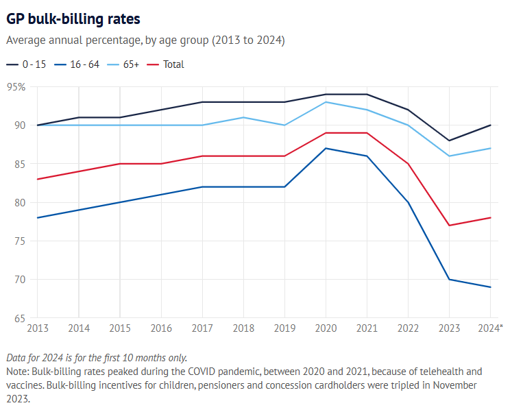 过去几年,由于Medicare的补贴没跟上通胀,加上医疗需求增加,GP的全额报销(bulk-billing)率不断下降。