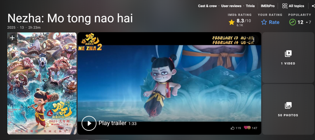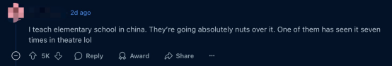首先是关注度上,由于《哪吒2》实在是太火,特别在打破多个票房纪录之后,很难不“勾”起海外网友的好奇。在一条讨论《哪吒2》登顶世界动画电影影史票房榜单的帖子下,一位自称在中国当外教的网友提道,“他们完全是狂热的状态,有个学生都看了7次了。”
