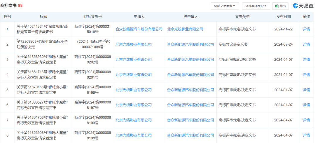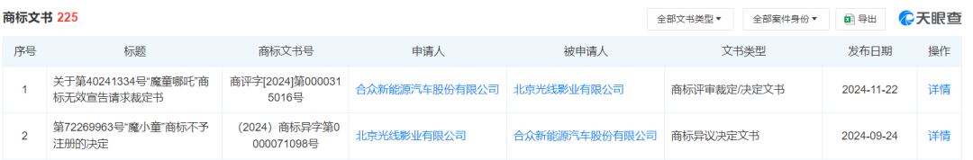 此外,哪吒汽车于2023年申请的一枚“魔小童”商标曾受到光线影业的异议,最终被商标局决定不予注册。光线影业还申请对哪吒汽车所申请的哪吒大魔童、哪吒小魔童等商标进行无效宣告。