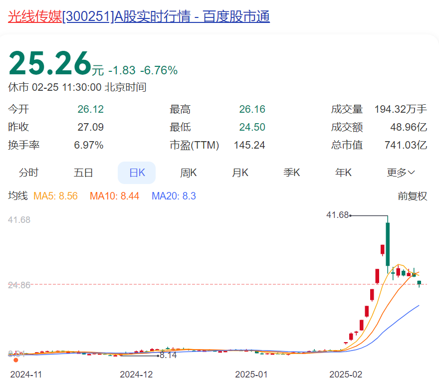 2月25日,光线传媒股价继续回调,截至中午收盘,跌幅超过6%,报25.26元,较一周前最高的41.68元跌近40%,不过仍较《哪吒2》上映前涨超160%。