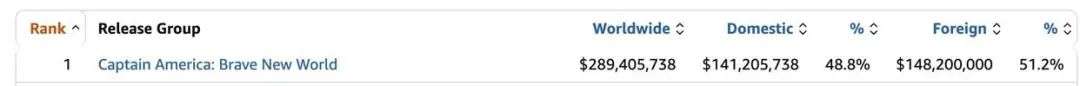 最新一期北美周末票房排名出炉,漫威超级英雄电影《美国队长4》(Captain America:Brave New World)蝉联冠军,“现象级”动画电影《哪吒之魔童闹海》(Ne Zha2)继续以最少的放映影院数量位列前五席。《美国队长4》自14日亮相以来稳居北美单日票房榜首;第二个上映周末尽管票房环比下跌68.3%,仍以约2820万美元蝉联北美周末票房冠军。这部科幻冒险动作片北美票房现约1.41亿美元,全球票房约2.89亿美元。