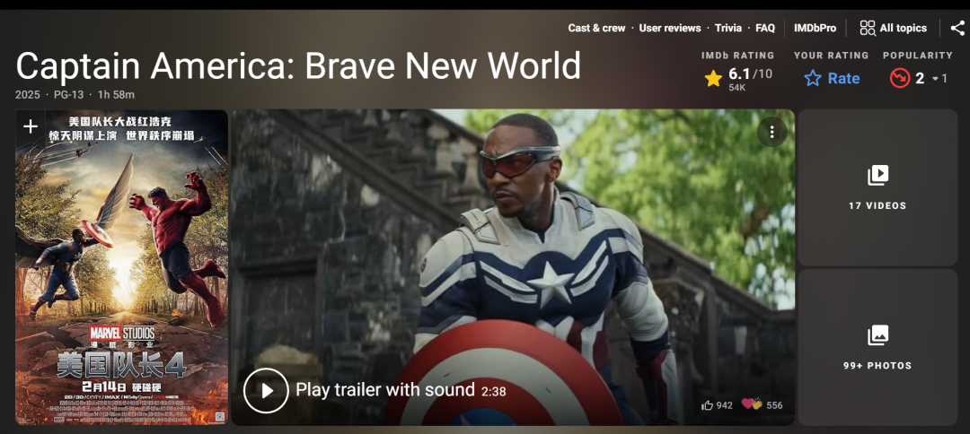 目前《哪吒2》在有“美国豆瓣”之称的IMDb网站评分为8.3分,而《美国队长4》仅为6.1分。在中国豆瓣网双方差距则更大:《哪吒2》为8.5分,《美国队长4》仅有5.2分。