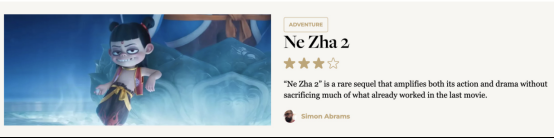 比如,以已故著名影评人罗杰·艾伯特(Roger Ebert)名字命名的资深影评媒体“罗杰·艾伯特”网站给予了《哪吒2》三星的评价(满分为四星),并称其“在不牺牲前作成功元素的前提下,进一步提升了动作场面和戏剧张力。”作为对比,同期在海外上映的《美国队长4》评分为一星。