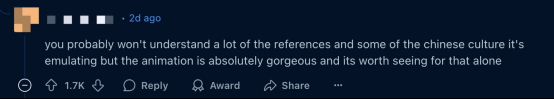 当然,这并不是个例。在有“美国版贴吧”之称的Reddit上,海外网友同样表达出对《哪吒2》的喜爱。
