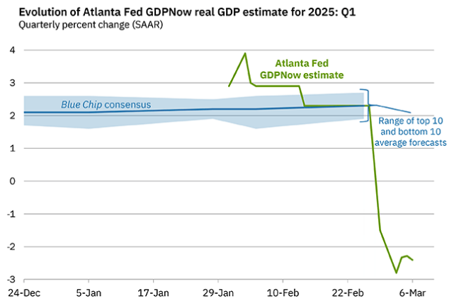 上周,亚特兰大联储的大幅下调了美国一季度GDP预期,其发布的GDPNow跟踪器显示一季度经济年化增速为-2.8%,进一步加剧了衰退担忧。