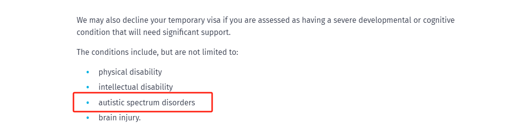 移民局官网表示,他们可能会拒绝自闭症谱系障碍患者的签证申请。