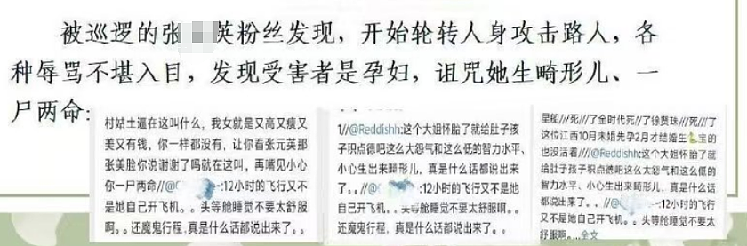 她不仅对这名孕妇进行辱骂,甚至通过“开盒”手段曝光她的真实姓名、身份证号、工作单位及家庭住址。在发现她是一名孕妇后,这些极端粉丝竟然留言诅咒: