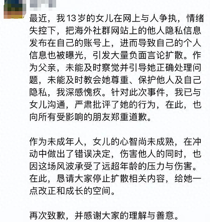 然而,这份全文强调“女儿未成年”“心智不成熟”,的道歉并未平息愤怒。