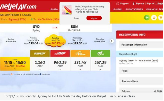与之形成鲜明对比的是,现在从悉尼到越南的国际航班商务舱票价与之相差无几,乘坐越捷航空从悉尼到胡志明市的商务舱票价仅为 1160 澳元。