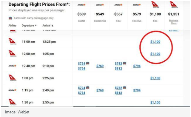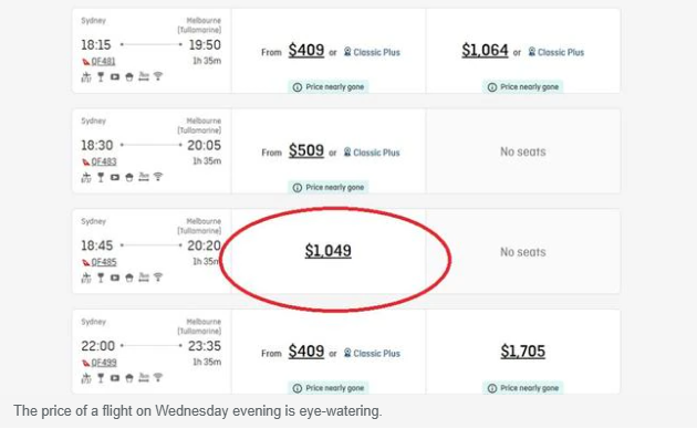 实际上,在 3 月 12 日那个时间,除了 1049 澳元的澳航航班,维珍澳大利亚从悉尼到墨尔本的经济舱票价为 344 澳元,捷星航空为 205 澳元。