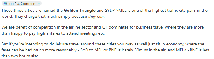 “悉尼到墨尔本是世界上客流量最大的城市对之一。他们能收取这么高的价格,仅仅是因为他们可以。