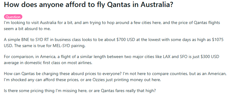 “在澳大利亚,人们怎么负担得起坐澳洲航空的费用?我打算去澳大利亚旅游,想在几个城市之间转机,但澳洲航空的机票价格对我来说似乎有点荒谬。澳洲航空怎么能向所有人收取如此离谱的价格?我不是想对比不同国家,但作为一个美国人,我很震惊有人能负担得起这些价格,还是说澳大利亚人都在印钱?是我忽略了什么定价规则,还是澳洲航空的票价真的那么高?”