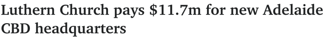 澳大利亚The Lutheran Church将把其全国总部迁至阿德莱德的中央商务区,此前,教会斥资 1170 万澳币收购了阿德莱德东端的一栋办公楼。位于Frome St的五层建筑将成为澳大利亚The Lutheran Church及其教会办公室的新址,而部分建筑仍将出租给现有租户。