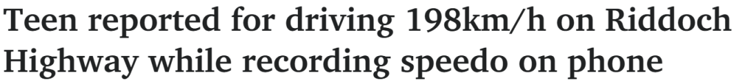 据报道,一名青少年在Riddoch Highway上以接近 200 公里/小时的速度行驶,同时用手机记录车速。周六晚上 6:30 左右,这名 17 岁的男孩在Naracoorte附近被执行速度检测任务的警察拦下。他们发现他的丰田轿车在标有 110 公里/小时的区域以 198 公里/小时的速度行驶。警方称,司机当时正在用手机记录车速表,两名乘客中的一名没有系安全带。司机被举报多项违法行为,包括超速驾驶、违反临时驾驶执照和 P1 司机使用手机。他的驾照立即被吊销 12 个月,他的车被扣押 28 天。他将被传唤出庭。