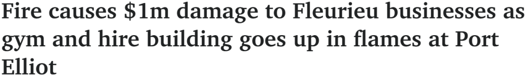 Port Elliot的一场大火烧毁了一座容纳两家商户的建筑,一夜之间造成了100万澳币的损失。周四午夜刚过,消防队员发现这座用作物业租赁和健身房的棚屋已完全着火。建筑是Diggermate迷你挖掘机租赁公司和Waves of Warriors泰拳训练中心的所在地。消防员使用呼吸器控制了火势,防止火势蔓延到附近的其他商户。