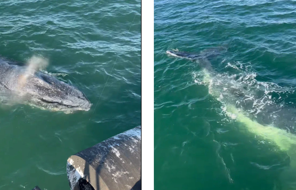 当时Zach Poole 正在钓鱼,他用相机捕捉到了这头友善的鲸鱼游过来的瞬间。他在视频下方配文道,并分享到了Facebook:一头罕见的非季节性座头鲸游到了离我们只有几米远的地方,一年中这个时候,这种景象真是难得一见。这头鲸鱼游到离人群几米远的地方后才游过来。这头雄伟的生物无惧鱼线,径直游到码头上迎接人群,还喷了好几次水。能够听到视频里有人说:我的天,它好大啊!