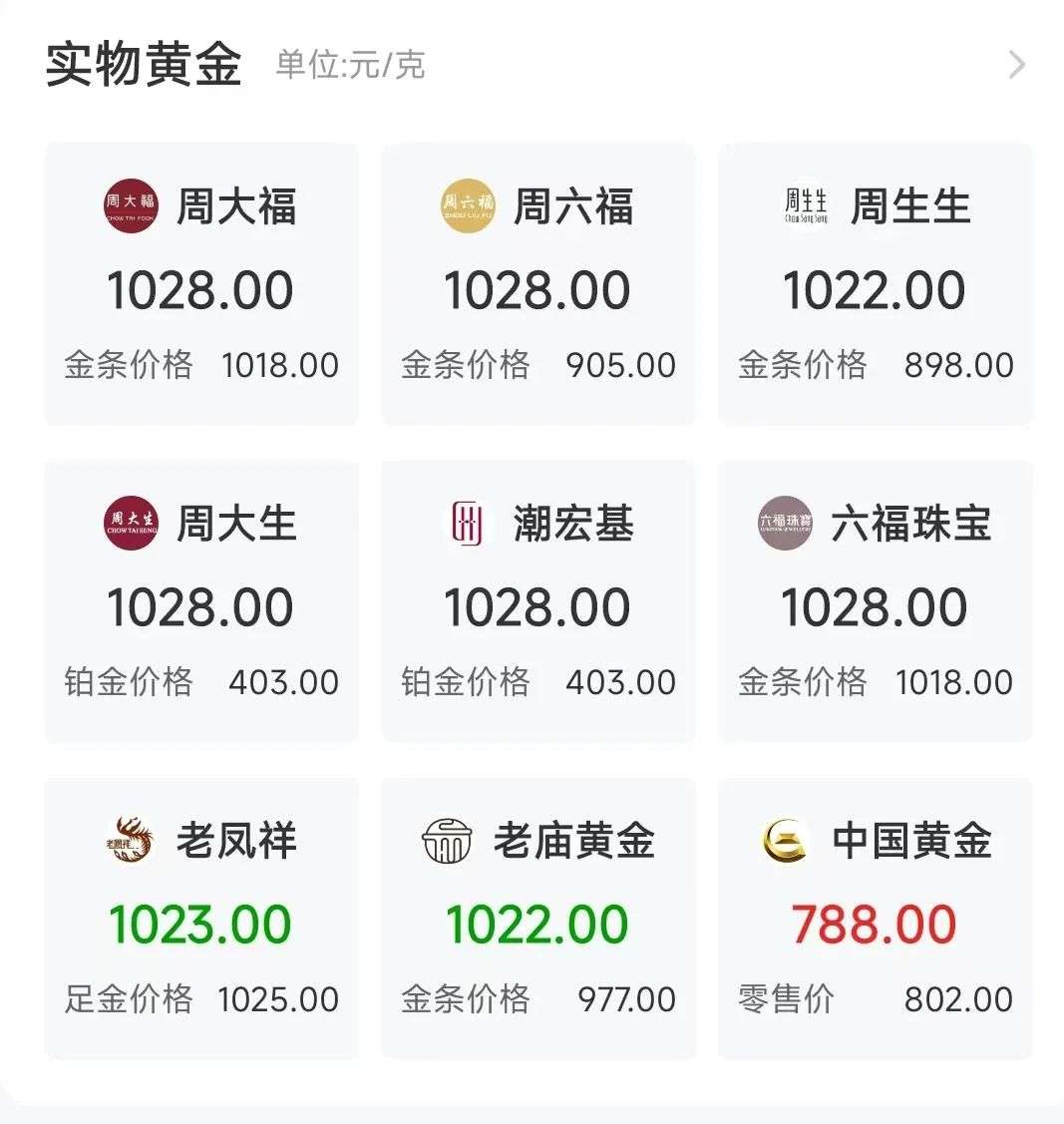 在零售端,今日周大福(01929.HK)、潮宏基(002345.SZ)、六福珠宝、周六福、周大生(002867.SZ)的首饰金价均为1028元/克,周生生(00116.HK)、老庙黄金的首饰金价为1022元/克,老凤祥(600612.SH)的首饰金价为1023元/克。