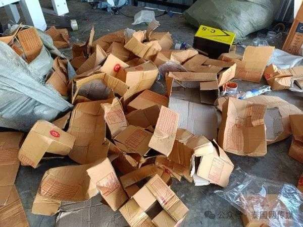 同时,在仓库内还发现被退回的包裹堆积如山,数量达数千箱,以及大量被撕毁丢弃的包裹箱。