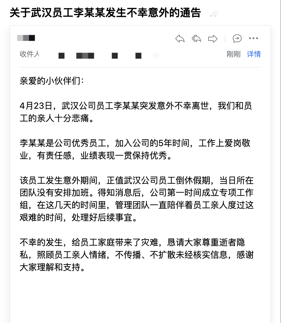25日,猿辅导方面证实其武汉公司员工李某某突发意外不幸离世。