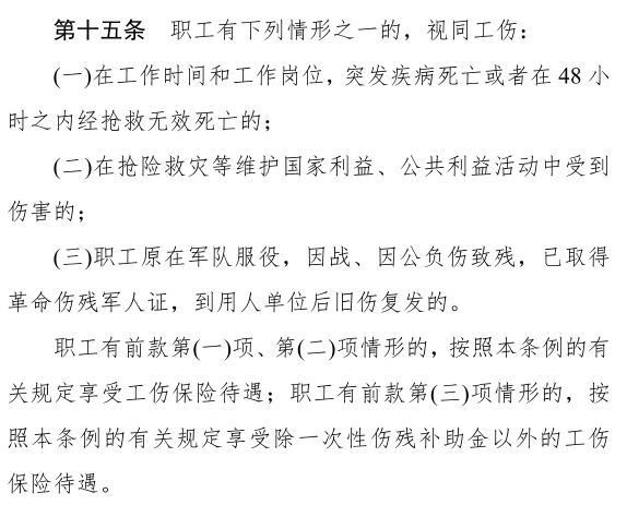 据悉,《工伤保险条例》第十五条规定,在工作时间和工作岗位,突发疾病死亡或者在48小时之内经抢救无效死亡的,视为工伤。湖南公言(深圳)律师事务所主任李胜春律师曾表示,该规定的关键点有两点,一是起算时间:以医疗机构初次诊断时间为准;二是“抢救无效”的认定需医疗机构出具明确结论。
