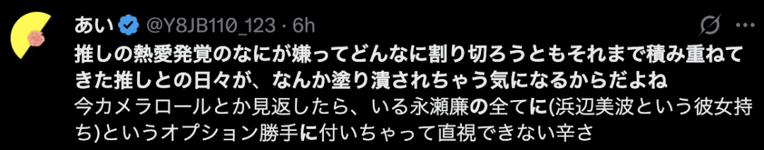 “偶像不是说不谈恋爱吗”、“我最讨厌偶像恋情曝光的,就是无论我怎么努力去接受,都感觉之前和他一起度过的时光仿佛被抹去了一般。现在回头翻看相机胶卷,永濑廉的每一张照片都自动被贴上了“他有女朋友,滨边美波”,痛苦得让我无法直视。”