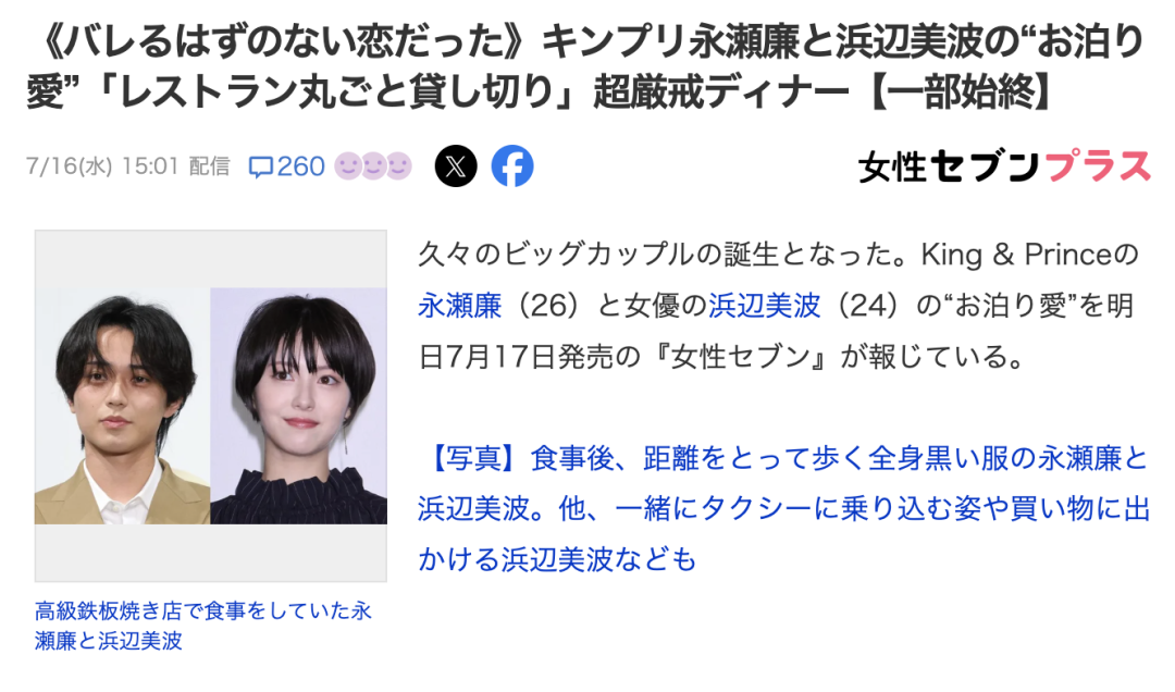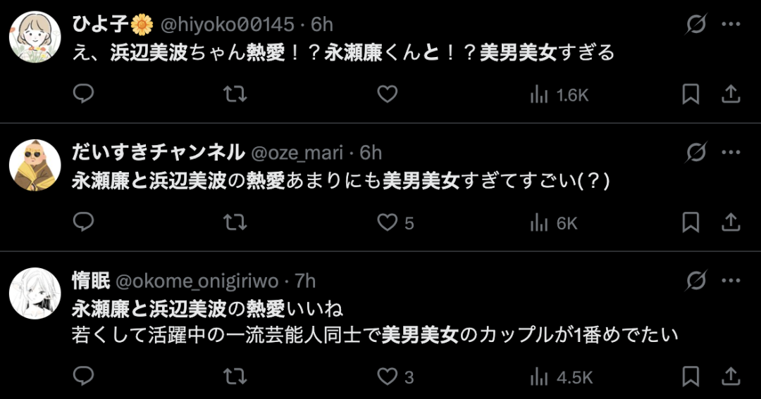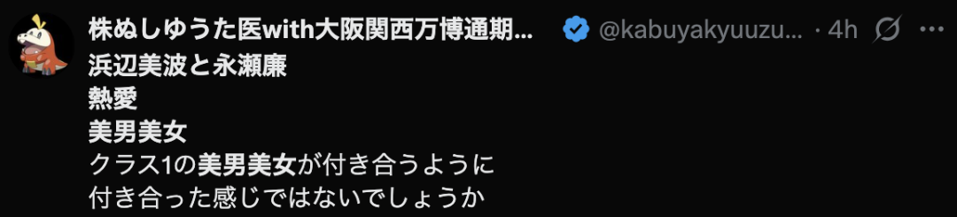 “永濑廉和滨边美波正在热恋中。很高兴看到如此美好的一对情侣,两人都是年轻且活跃的顶级艺人。”