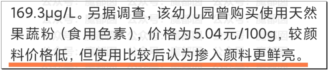 第一段解释了颜料的事情,还真的是颜料……现实往往比故事更加狗血……一开始用的倒是果蔬粉(色素),后续嫌弃颜色不够艳丽,直接用颜料……我们真的无语,真的是有点无厘头了,难道一个幼儿园就是靠绝对鲜亮的颜色去吸引生源?我们看了通报依然想不通为何要这么做。