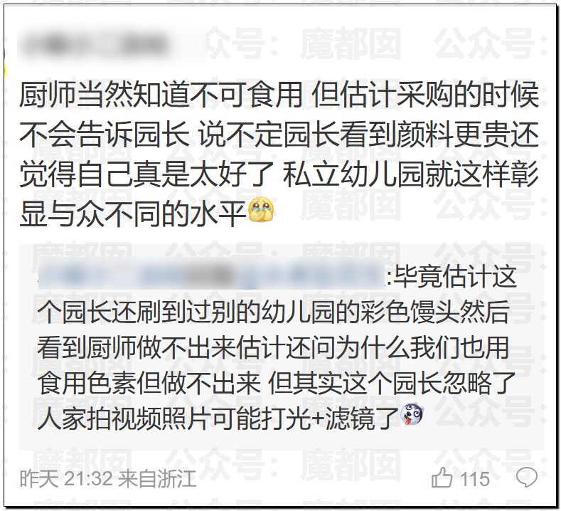 网友们进一步分析可能园长看了其他幼儿园的食品,不知道很多照片是可以修的,所以一定要厨师做出那么鲜艳的颜色。
