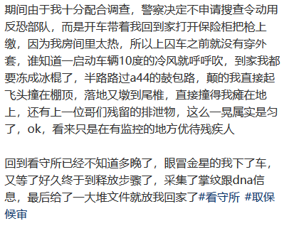 他表示,警察在车内保险箱里发现了子弹,所以把他抓了,在拘留所里面待了9个小时,因为有残疾,获得了一定的优待:
