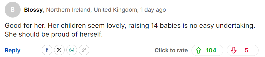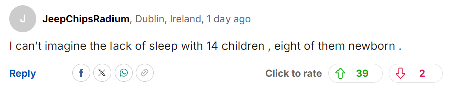 “真为她高兴。她的孩子们看起来都很可爱,抚养14个孩子实属不易,她值得为自己感到骄傲。”