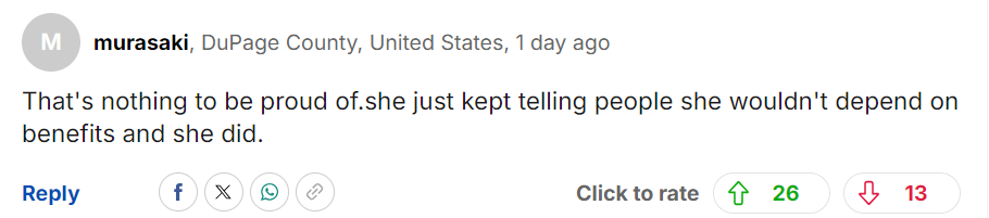 “这根本不值得骄傲。她一直说自己不会依赖福利,结果还是走蛀虫路线。”
